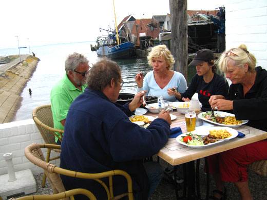 Wij bleken ook weinig van de mossel te weten. Bijvoorbeeld: dit jaar is het niks met de Zeeuwse mossel; maar 19% visgewicht, zei een kenner, tegen normaal 23%. Waarom vissen ze ze die dan op? Omdat: als er één mosselvisser gaat, dan gaan ze allemaal, of die mossel op gewicht is of niet. Toch aten wij lekkere mosselen in het Zeeuwse, maar dan Griekse. (Van het eten van mosselen kun je trouwens rare tandjes krijgen; beweeg muis maar over plaatje.)
